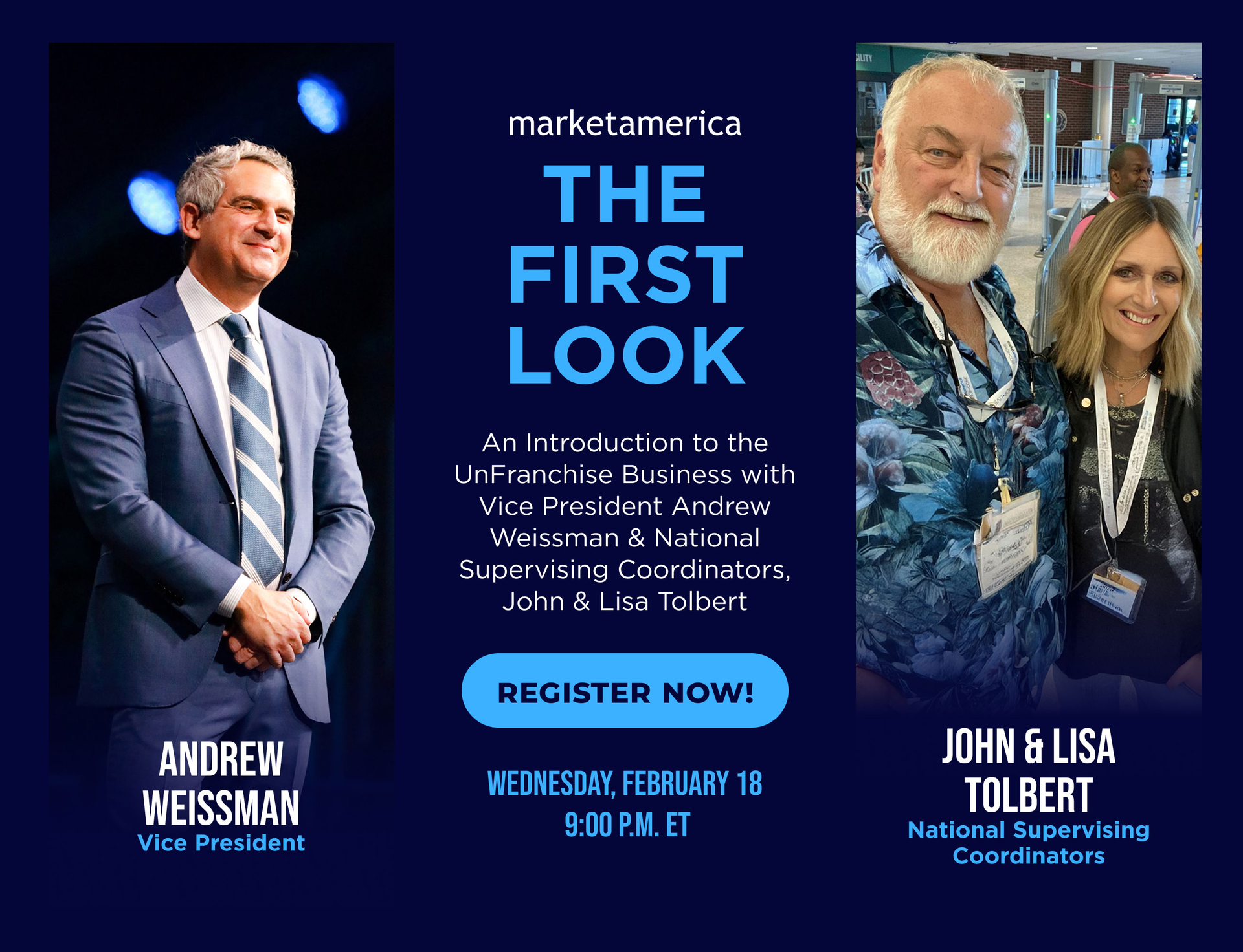 If you’re looking for the perfect opportunity to introduce guests to the power of Market America Worldwide | SHOP.COM, this is it. On Feb. 18 at 9:00 p.m. ET , join Vice President Andrew Weissman along with National Supervising Coordinators John Tolbert and Lisa Tolbert for a dynamic and informative First Look presentation . This high-impact session is designed to give prospects a clear, compelling introduction to the Market America Worldwide | SHOP.COM business model. Your guests will gain insight into the entrepreneurial opportunity, the systems that drive success and the leadership support that sets our community apart. Led by some of the most respected leaders in the business, this presentation is more than an overview — it’s an invitation to think bigger, see possibility and awaken true entrepreneurial potential. The session will be conducted in English, with Chinese translation available , making it accessible to a broader global audience. Invite boldly. Follow up confidently. And position your team for growth. Register now and make sure your guests don’t miss this powerful First Look experience.