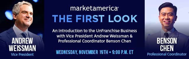 Get ready for an inspiring First Look presentation designed to introduce guests to the power, purpose and possibility of the UnFranchise® Business. On Tuesday, Nov. 19 at 9:00 p.m. ET, Vice President Andrew Weissman and Professional Coordinator Benson Chen will lead a dynamic session that showcases the Market America Worldwide | SHOP.COM business model and the entrepreneurial potential it offers.