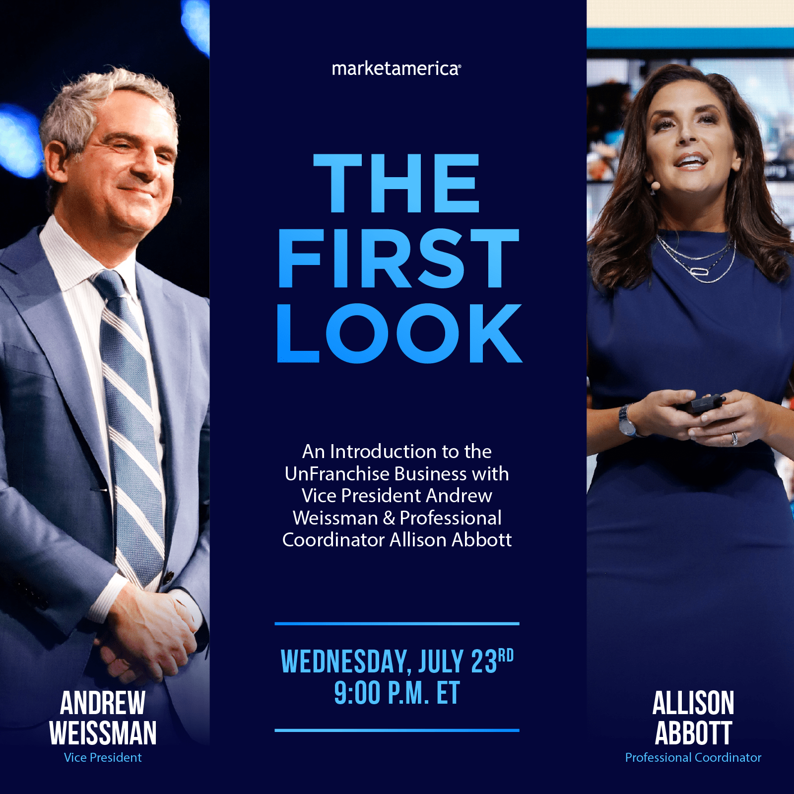 Join Vice President Andrew Weissman and Professional Coordinator Allison Abbott for a can’t-miss First Look presentation on Tuesday, July 23 at 9:00 p.m. ET. This dynamic session is the perfect opportunity to invite prospects and guests to learn about the Market America Worldwide | SHOP.COM business.